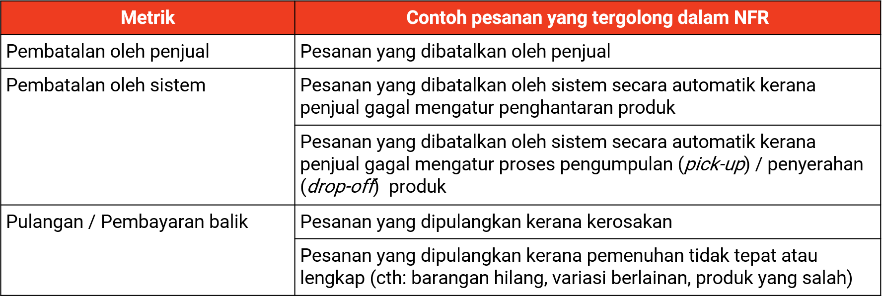 NFR = Pembatalan oleh Penjual + Pembatalan oleh sistem kerana penjual gagal mengatur penghantaran + Return/Refund
