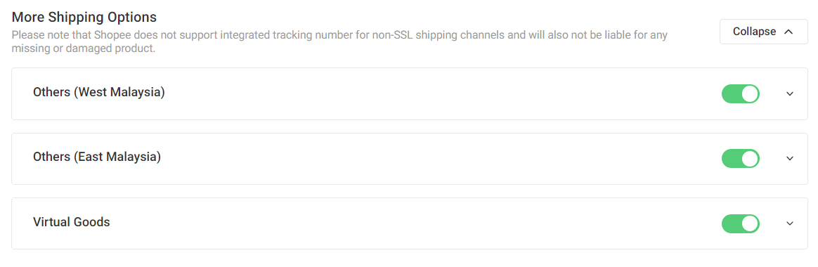3. Kadar Return/Refund yang rendah dengan penghantaran "Others (West & East Malaysia)" / "Virtual Goods". Kegagalan untuk mengekalkan prestasi boleh menyebabkan saluran penghantaran "Others (West & East Malaysia)" / "Virtual Goods" dikeluarkan.